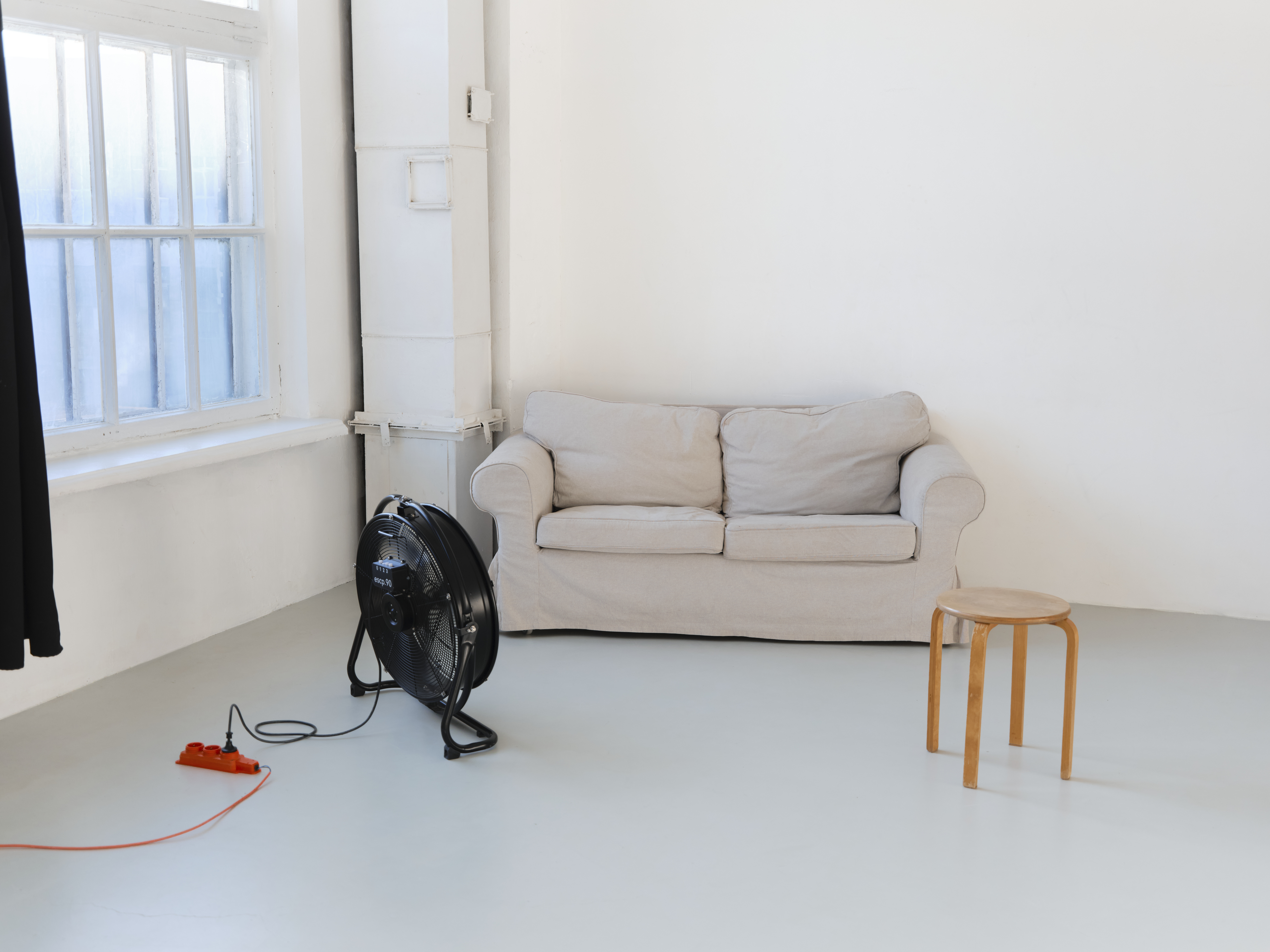 Зала з бетонною підлогою. 4 великих деревʼяних вікна, виходять на південь.